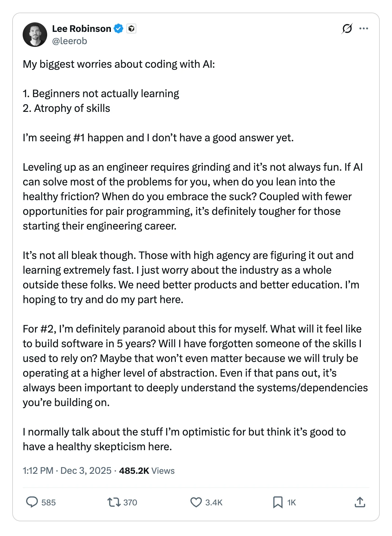For developers who are just starting out in their career these tools can be highly tempting to do the majority of the work for them. What may get lost here is the often draining and painful work through bugs and issues that are tricky to debug and solve, aka “the grind”. Even Cursor AI’s very own Lee Robinson questions this in one of his posts: